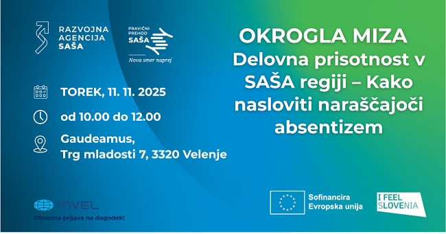 Dogodek z naslovom Delovna prisotnost v SAŠA regiji – Kako nasloviti naraščajoči absentizem bo namenjen vodjem, direktorjem in strokovnjakom s področja kadrov, zdravja pri delu in organizacijskega razvoja. V zadnjih letih se podjetja v SAŠA regiji soočajo z izrazitim porastom bolniških odsotnosti in vse pogosteje z izzivi, povezanimi z duševnim zdravjem zaposlenih, delovno motivacijo ter vračanjem po dolgotrajnih odsotnostih. Okrogla miza bo osvetlila razloge za naraščajoči absentizem ter poiskala učinkovite rešitve in pristope, ki temeljijo na sodelovanju med delodajalci, zdravstvom in institucionalnimi deležniki.