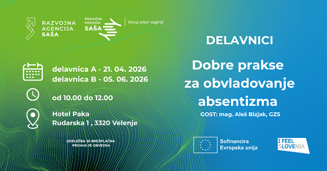 Razvojna agencija SAŠA in Center za pravični prehod SAŠA vabita na dve medsebojno povezani interaktivni delavnici »Dobre prakse za obvladovanje absentizma«, ki bosta potekali: