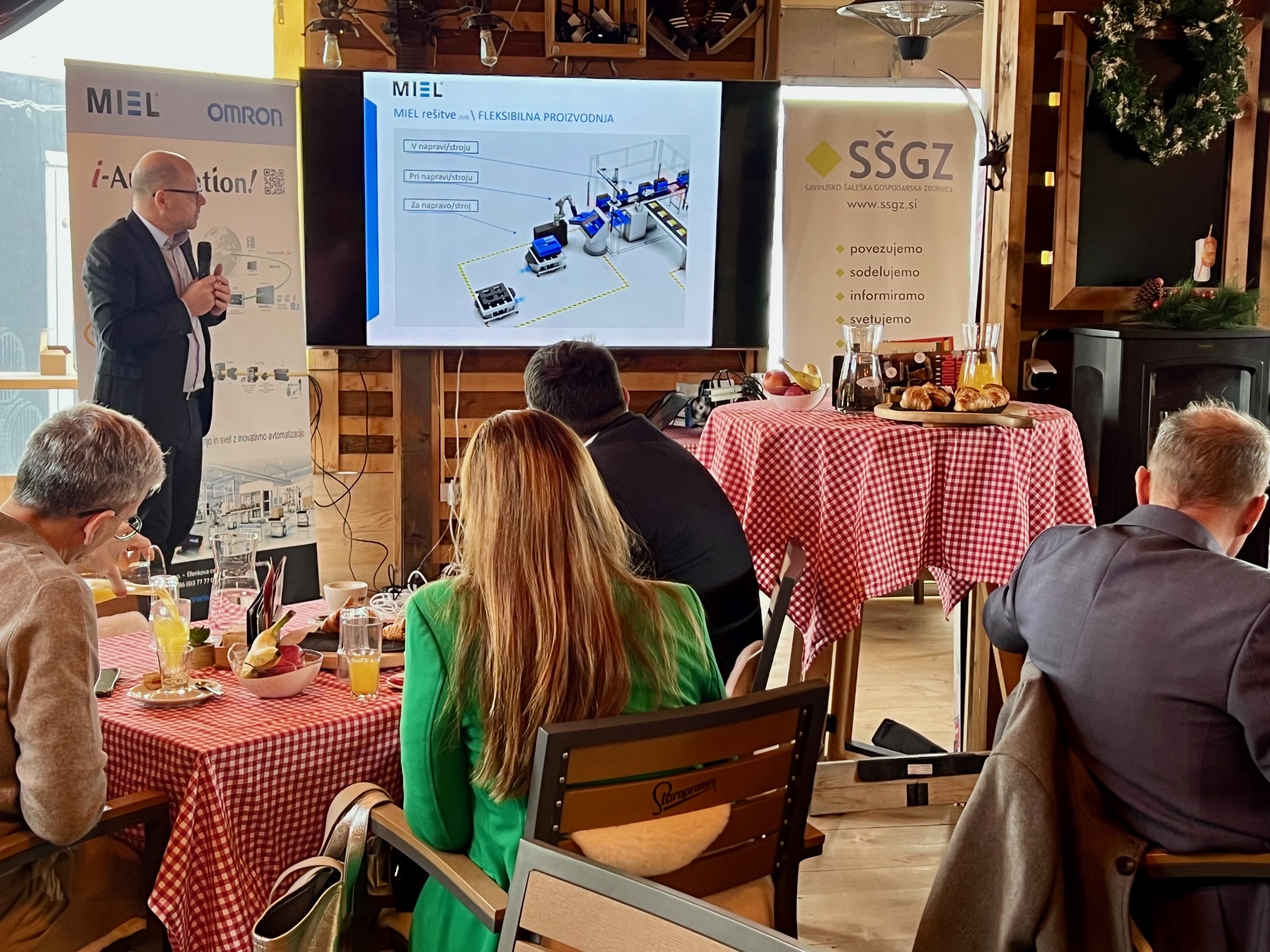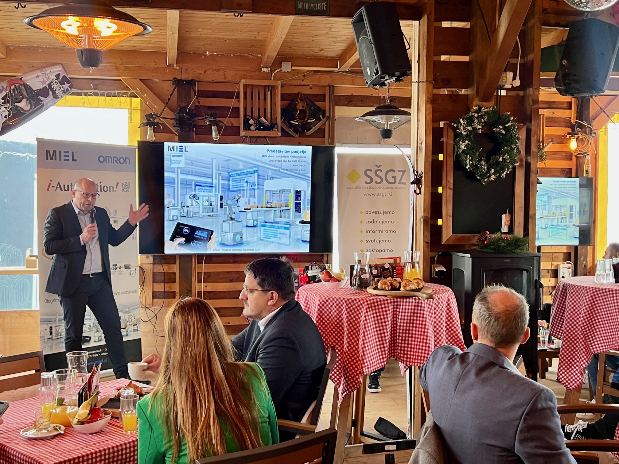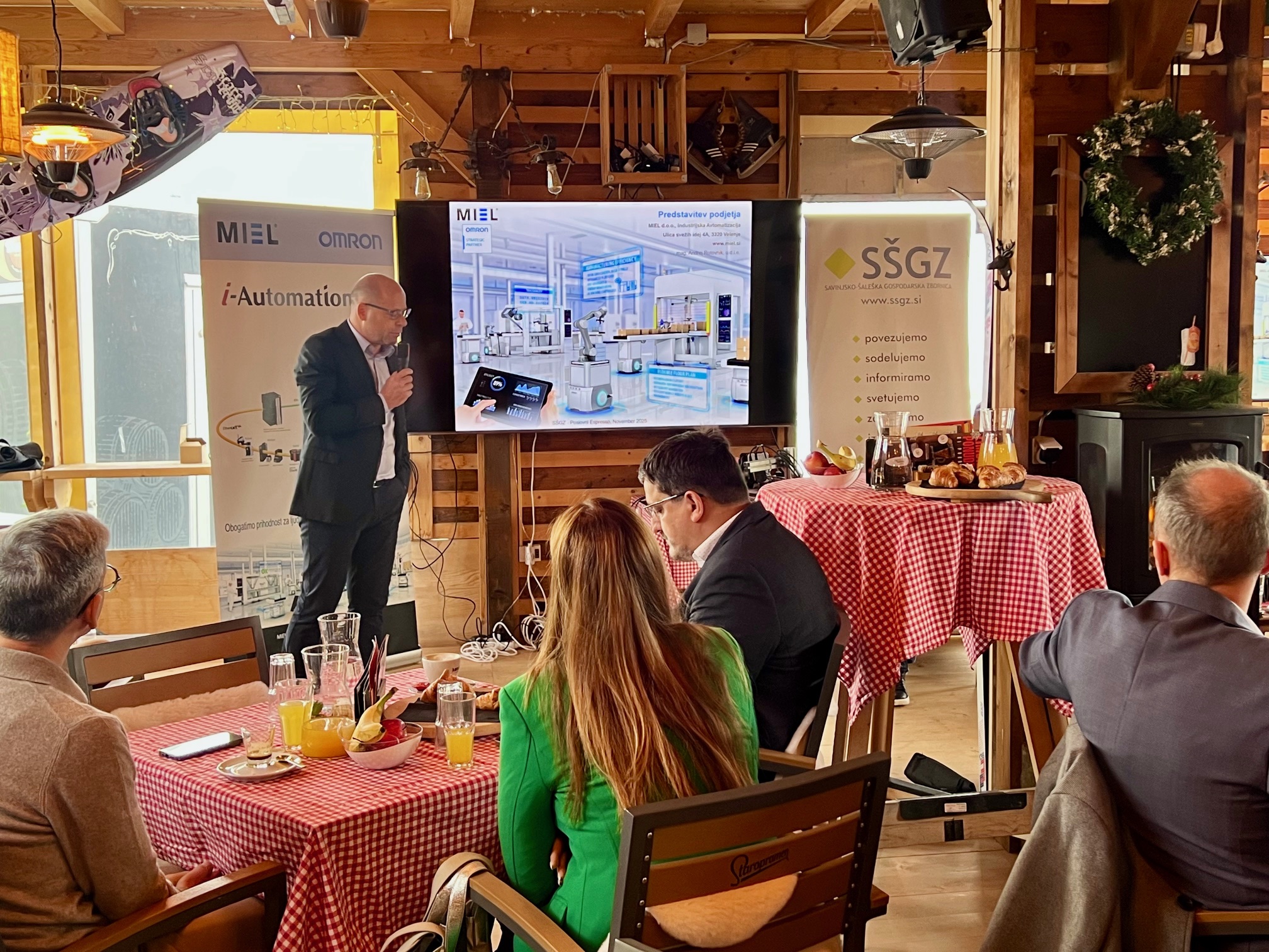 Direktor podjetja, mag. Andrej Rotovnik, je v uvodnem delu dogodka predstavil razvojne mejnike podjetja in njhov današnji obseg delovanja. Poudaril je, da MIEL danes ponuja celovite rešitve za industrijsko avtomatizacijo – od načrtovanja in razvoja sistemov do tehnične podpore in servisa. V središču njihovega delovanja so pametni stroji, pametne linije in pametne tovarne, ki temeljijo na integraciji umetne inteligence, industrijskega interneta stvari (IIoT) in robotskih sistemov.